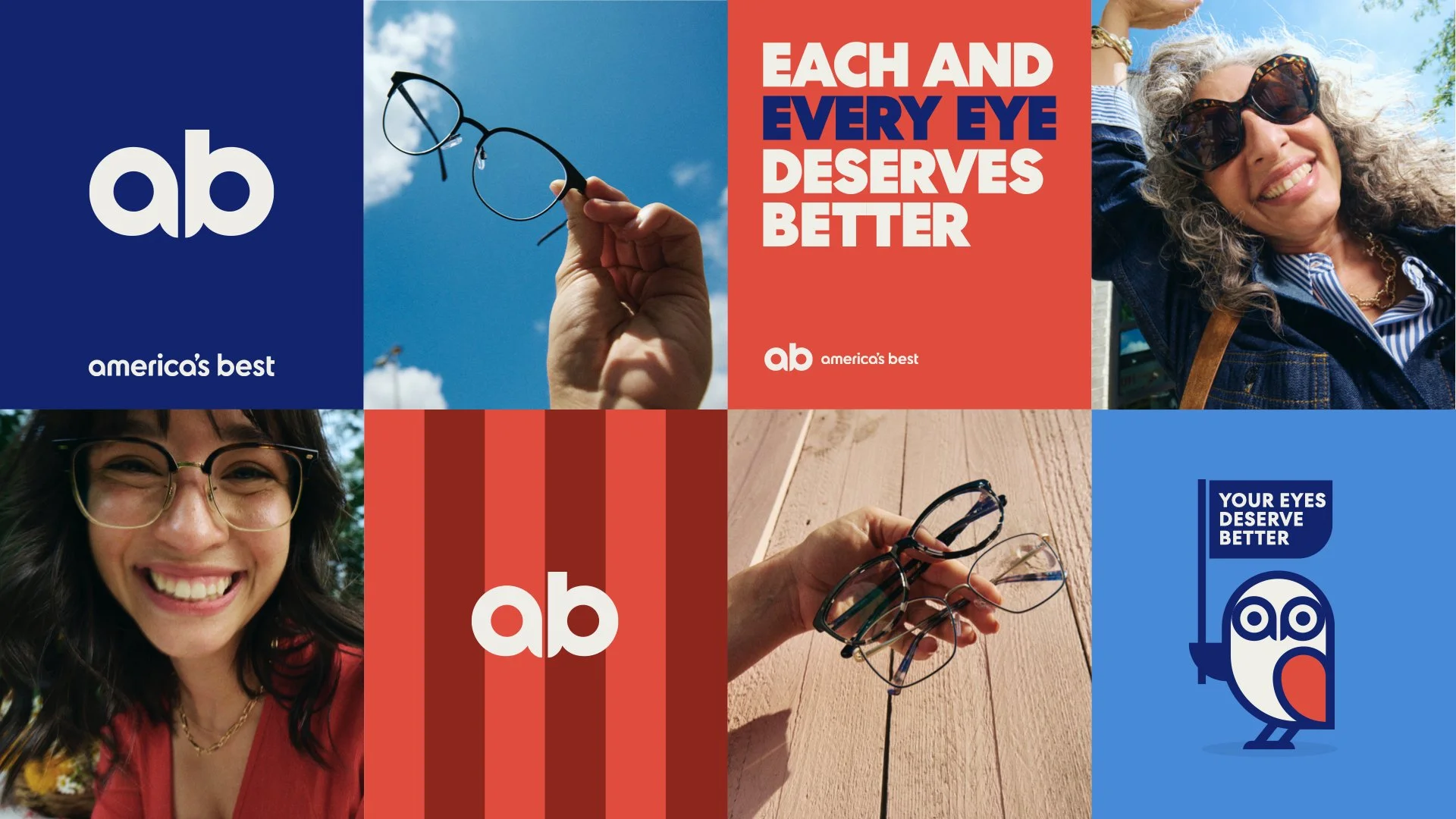 America’s Best looked and sounded like every other corporate eye care brand. Heavy on deals, light on humanity. The existing identity leaned on loud promotional language and a long-standing owl mascot that distracted from the real story: people, confidence, and care. To move forward, the brand needed to stop shouting prices and start showing people what better vision actually feels like in real life.