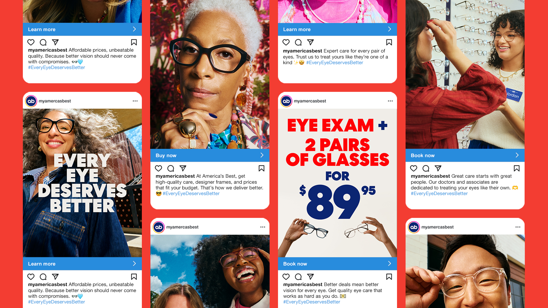 America’s Best came to us at a real turning point. The brand was known for affordability but was visually dated, overly promotional, and missing warmth. The challenge wasn’t just to refresh the look. It was to make people feel cared for in a category that rarely does. Our task was to modernize the brand, humanize the experience, and prove that affordable eye care doesn’t have to feel cold, corporate, or generic.